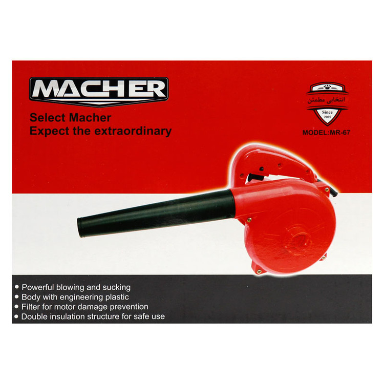 پمپ باد دمنده و مکنده Macher مدل MR-67 ساخت شرکت مچر مجهز به یک موتور با توان کلی ۵۰۰ وات بوده که سرعت گردش موتور داخلی آن در حالت آزاد ۱۳۰۰۰ دور در دقیقه است و هوای خروجی آن معادل ۲٫۸ متر مکعب بر دقیقه می باشد، همچنین انرژی مورد نیاز آن نیز از طریق برق شهری با ولتاژ ۲۲۰ ولت تامین می گردد. سرعت گردش باد ایجاد شده توسط پمپ دمنده Macher می تواند برای زدودن گرد و خاک از سطوح مختلف شامل اجزای داخلی کامپیوتر و ... مورد استفاده قرار گیرد، به طوری که با داشتن یک لوله پلاستیکی قادر است بخش های مختلفی که دست کاربر به آن ها دسترسی ندارد را نیز تمیز نماید. بر روی بدنه دستگاه دمنده مچر MR-67، یک کلید فیزیکی نیز تعبیه شده تا کاربر از آن جهت تنظیم سرعت باد مطابق با نیاز خود استفاده نماید. بدنه این دستگاه پمپ باد با طراحی جمع و جور و وزن سبک از جنس پلاستیک مقاوم در برابر ضربه و فشار ساخته شده، علاوه بر آن دارای طراحی ارگونومیک با قابلیت حمل و استفاده آسان و کابلی با طول متناسب می باشد.