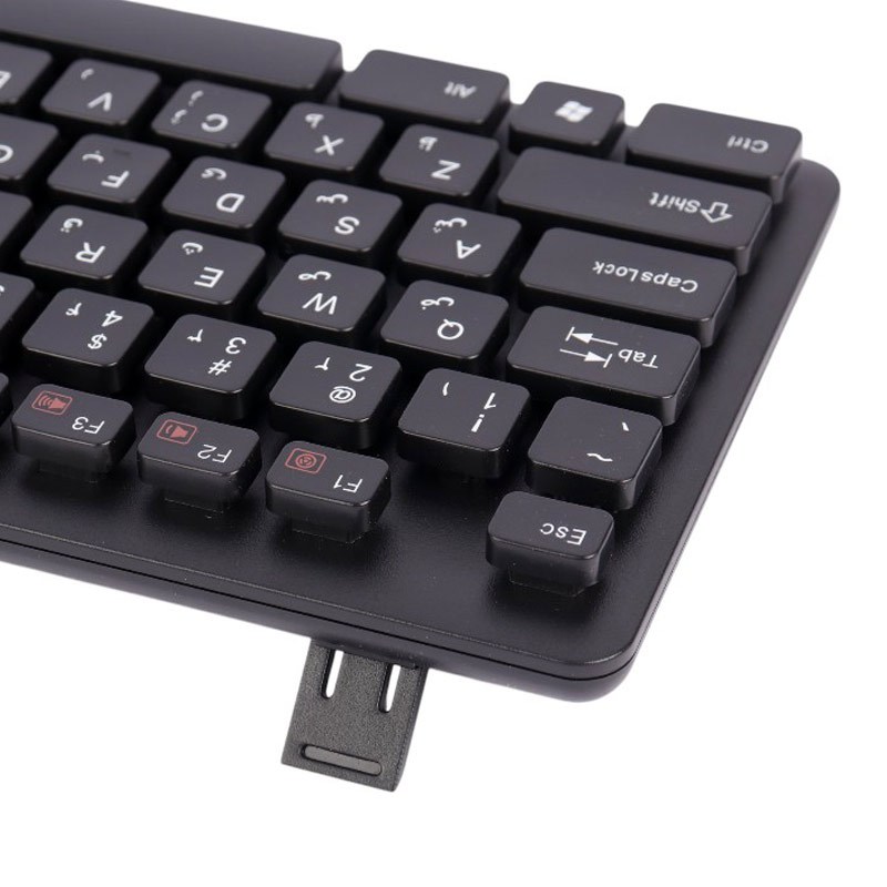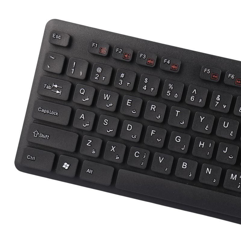 مجهز به 104 کلید فیزیکی با حروف حک شده فارسی و عمر مفید 10 میلیون بار کلیک، دارای کلید Fn و 12 عدد کلید مولتی مدیا